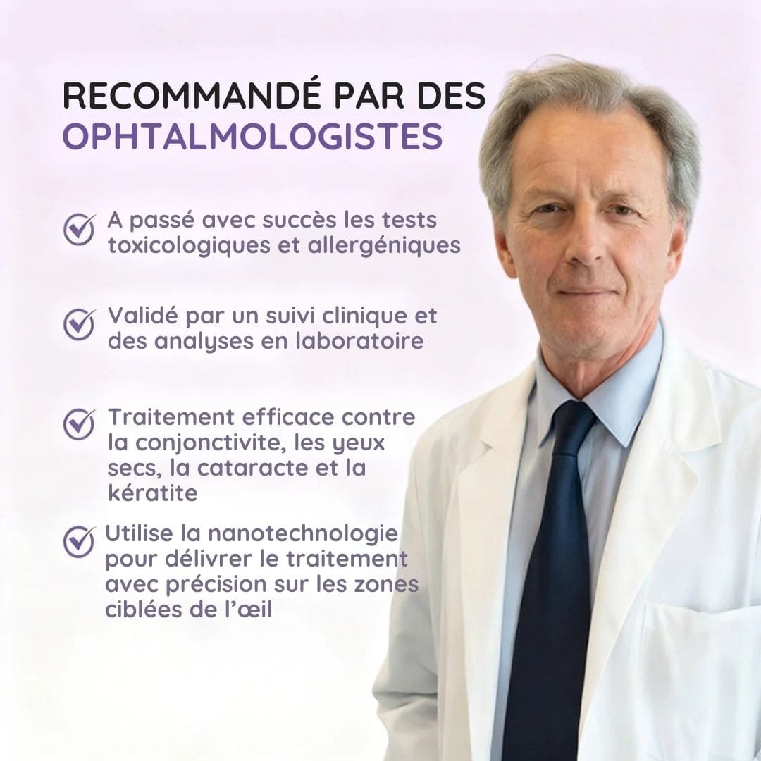 Conditions ciblées : conjonctivite, yeux secs, cataracte, glaucome