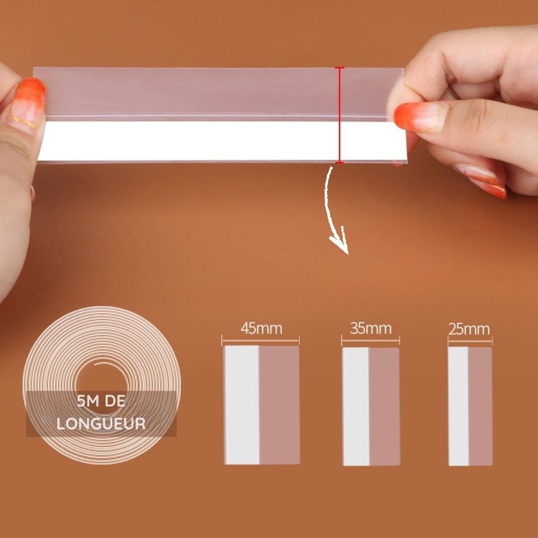 Pas besoin de perceuse ou d’outils : il suffit de retirer le film protecteur et de coller la bande sur une surface propre et sèche.